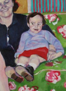 Much of my artwork has to do with motherhood: the dynamics between a mother and her child, as well as those between a mother and her mother. My own mother frequently appears in my paintings, almost always as a child. Painting her this way helps me understand her better and makes me feel closer to her. It also has the odd effect of reversing our roles, where I can look upon her through the eyes of a mother.